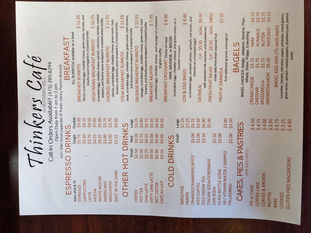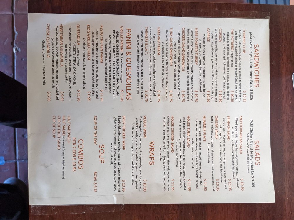 Thinkers Cafe Menu